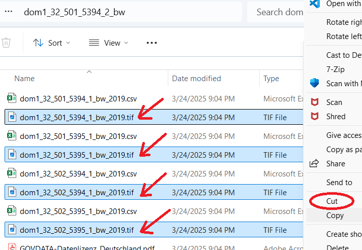 - Follow the same steps above for the DGM025 data as we did earlier for the DOM1 data. Download and extract the files, and move the TIF files to the geodata folder, removing the leftover extracted folders and anything else inside them.