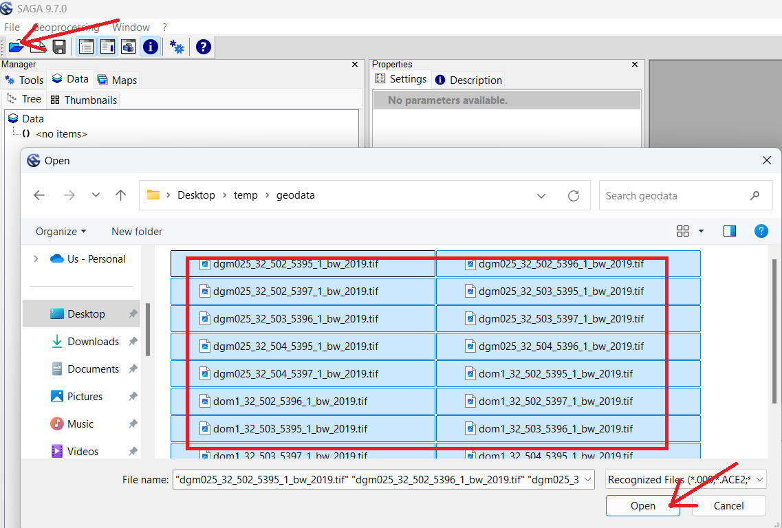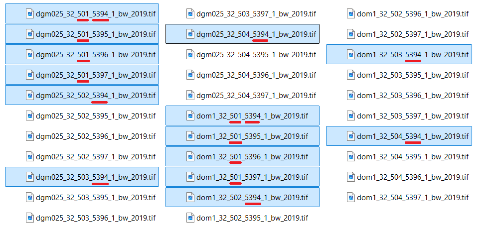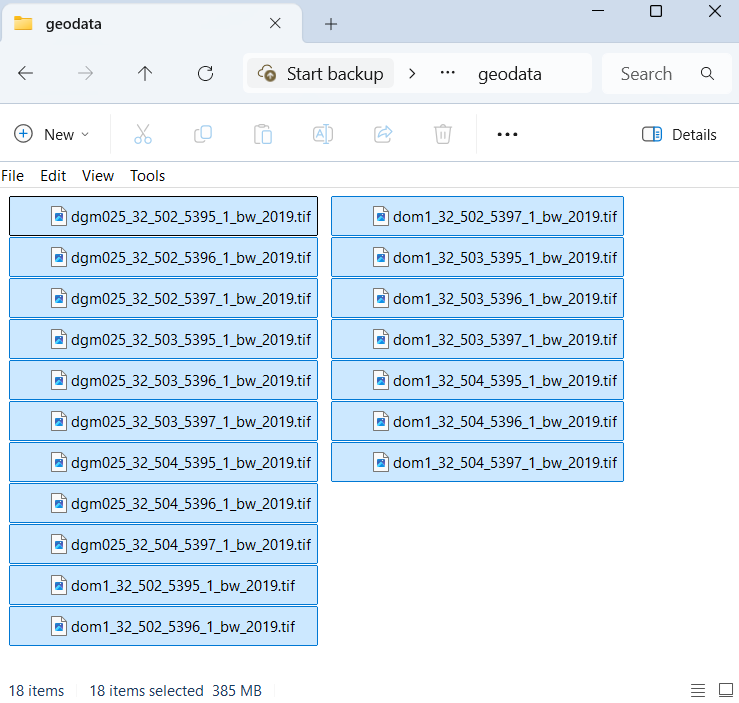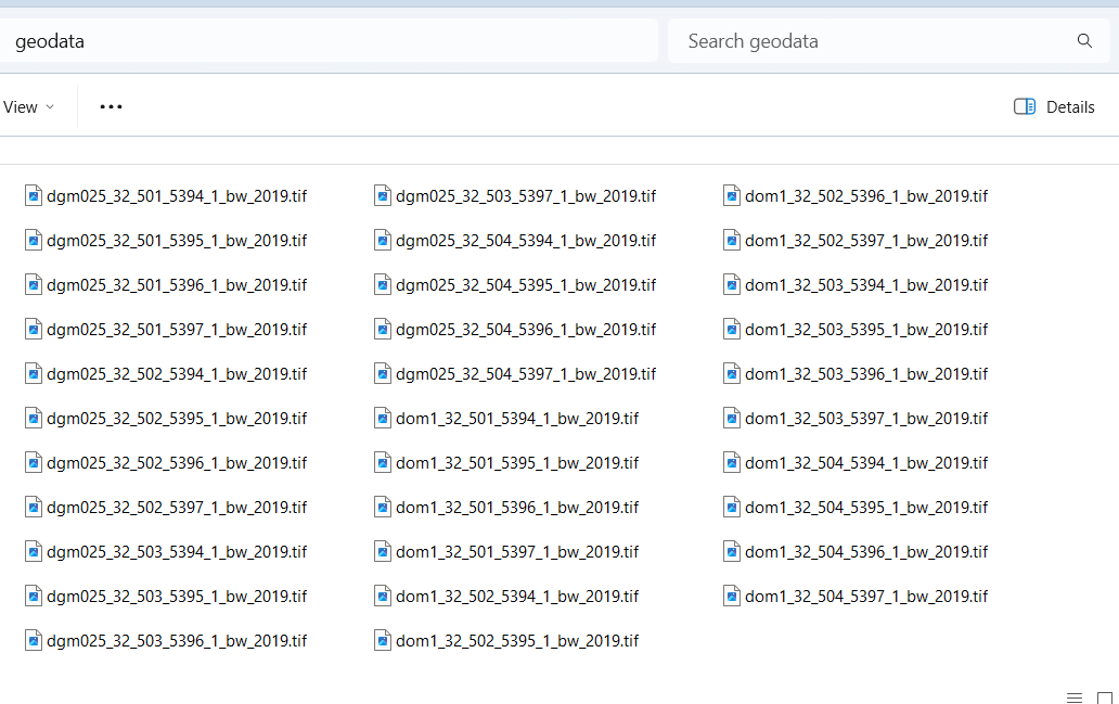- In the geodata folder of our example, we have now 32 LIDAR files (16 DOM1 and 16 DGM025 files).
