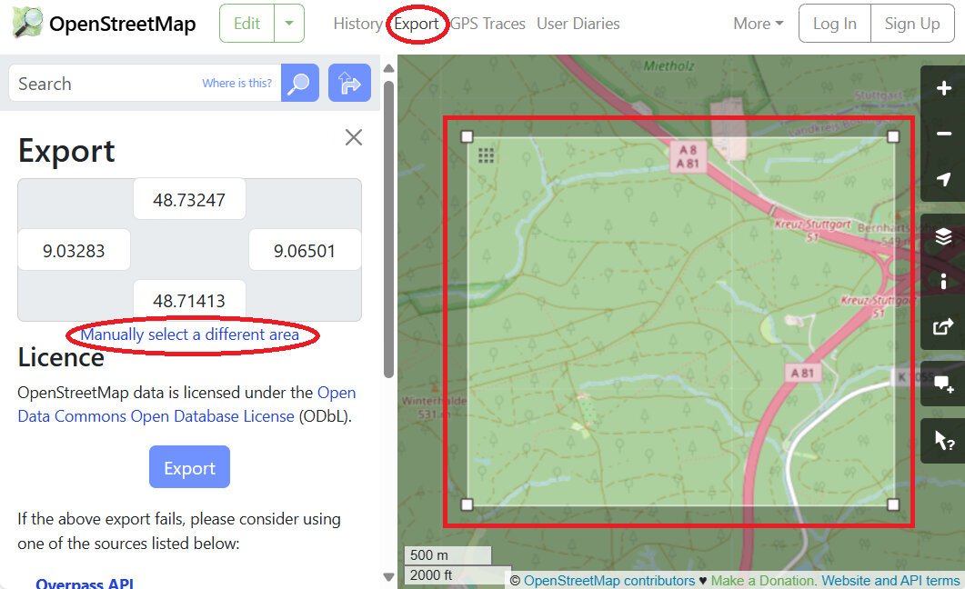 - Click the "Manually select a different area" link beneath the export coordinates.