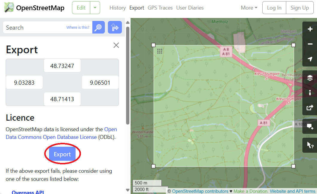 - OSM download 1 (degrees): north 48.71413 to 48.72000, east 9.03283 to 9.06501