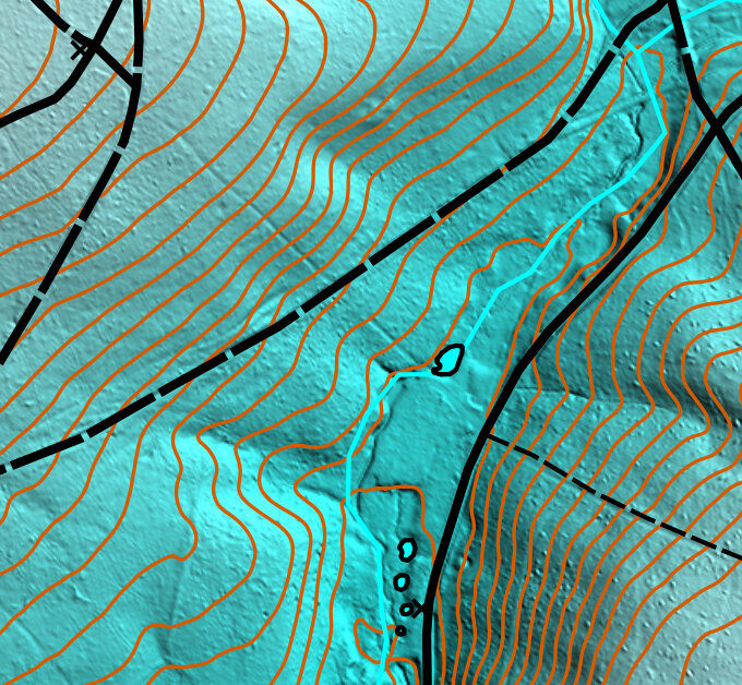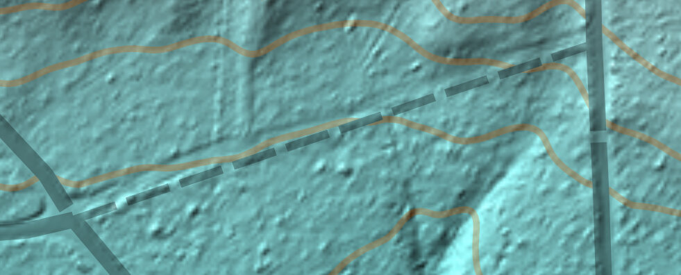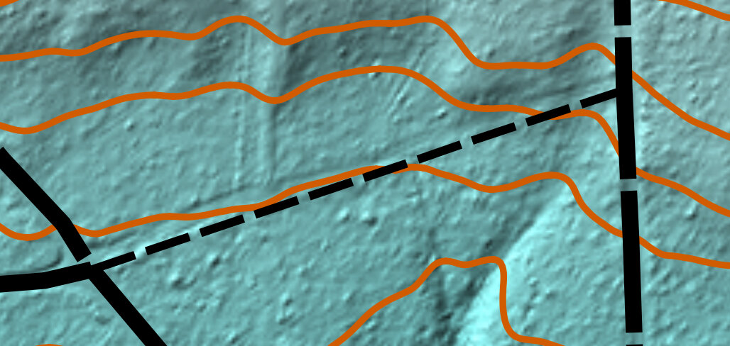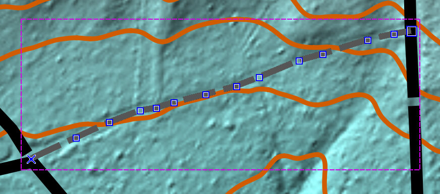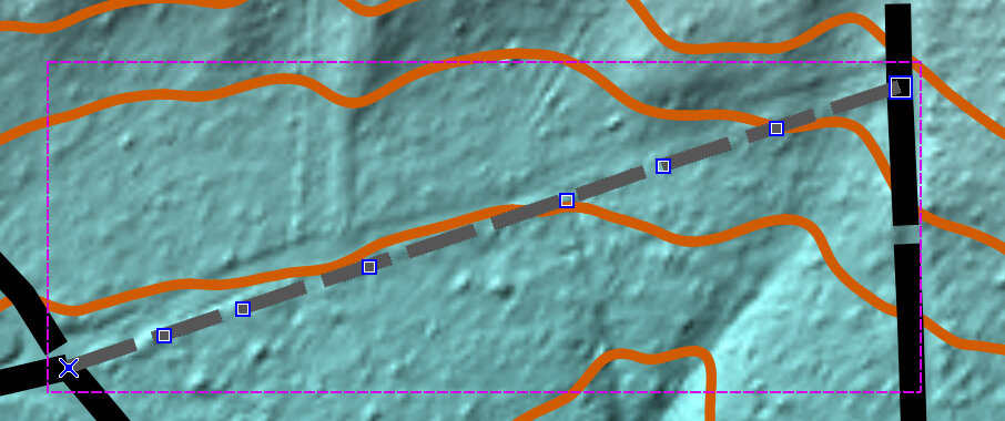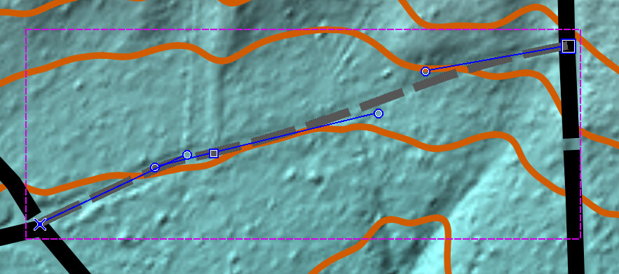 NOTE: Ordinarily we would recommend adding points like in the previous step, and curving the lines to make them fit the LIDAR topography better. But for unmapped trails/roads, it is better to wait until field-checking them, and confirming they exist, before spending a lot of time perfecting how they appear on the map.
