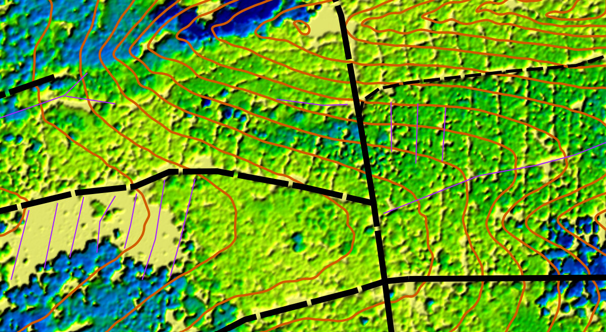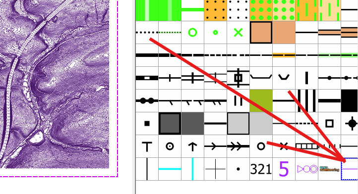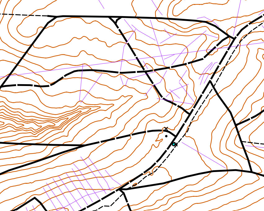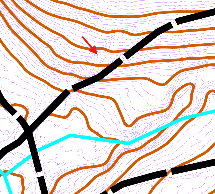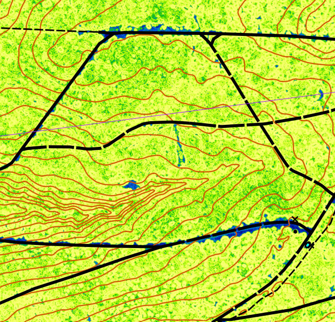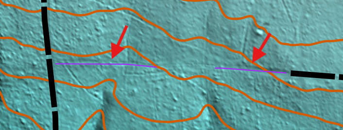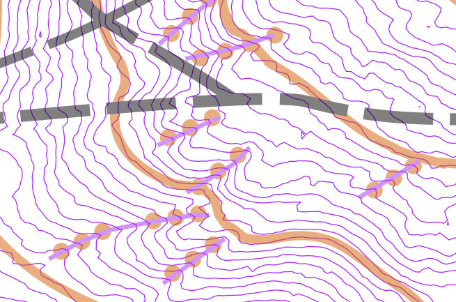- Mark them with the small erosion gulley (symbol 108), and also with purple line, so we know to check them in the field. (map is at 50% opacity to allow us to see the micro-contours.)