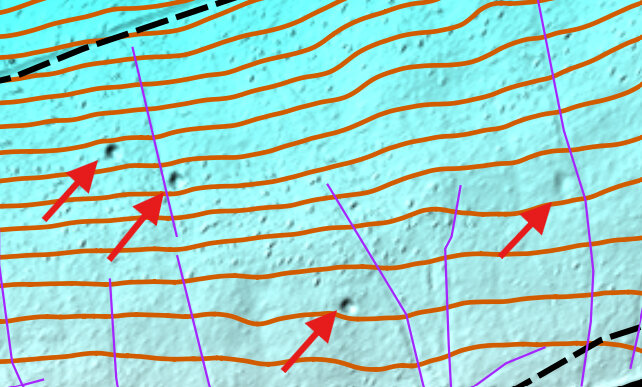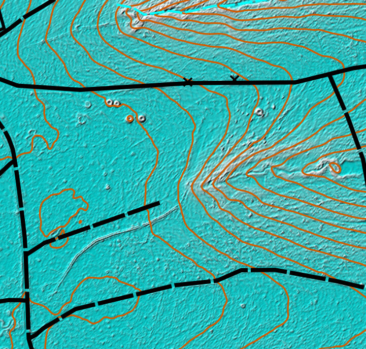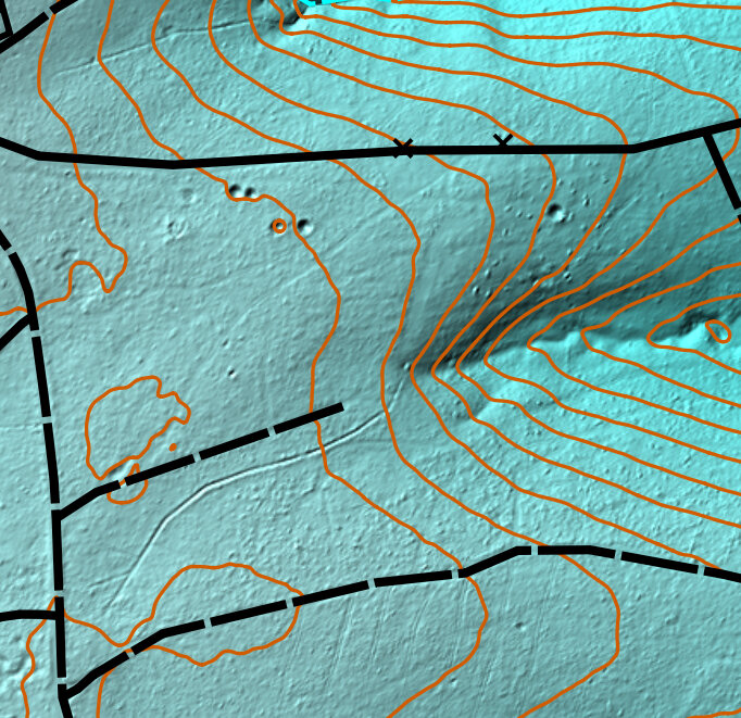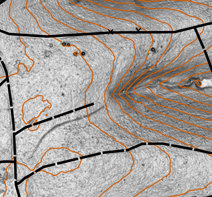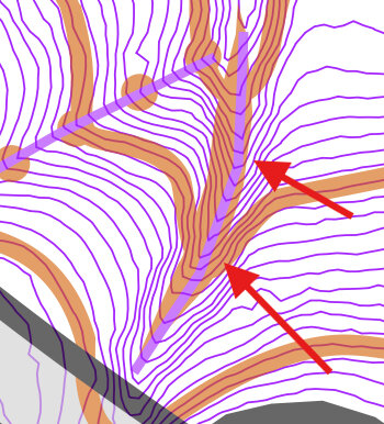 - Look for erosion gulleys and mark them in the same way. (map is at 50% opacity so we can see the steep contours.)