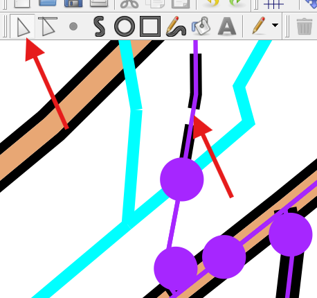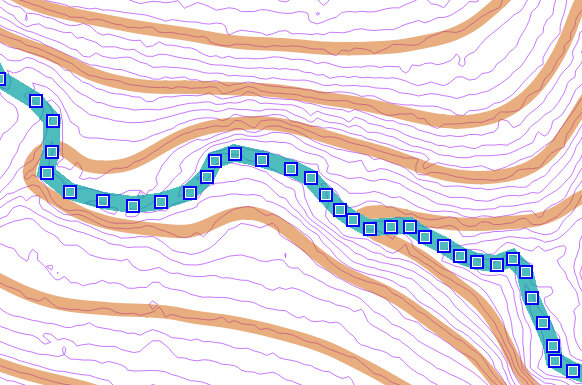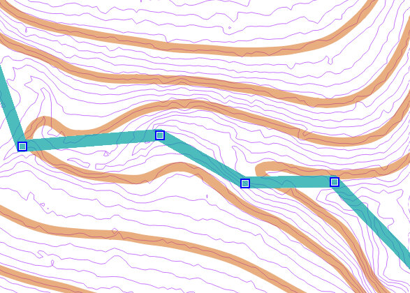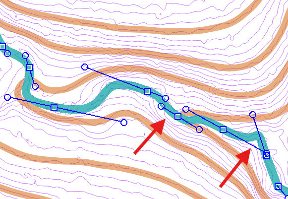 - Go through and add points on each line (by pressing CTRL while clicking on the line), and move the points to make the line match the terrain better, so they follow the pathway of lowest elevation.