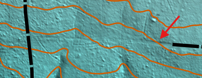 By zooming in and turning on the 'Contours_0.5m_Raw' template, we should be able to identify which feature is there, and mark it for field checking.