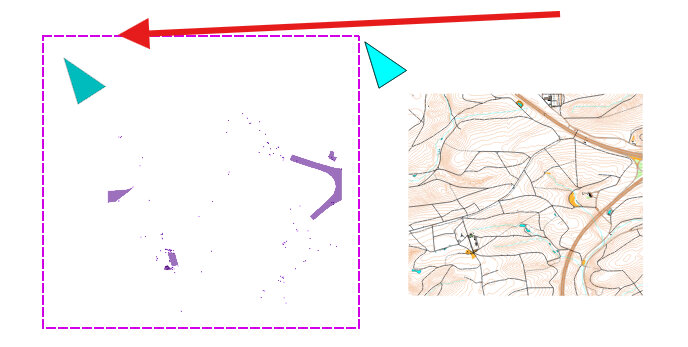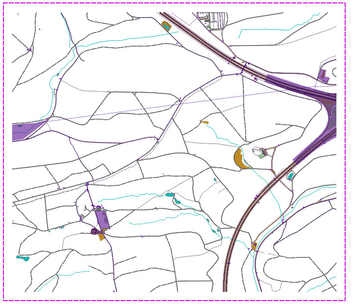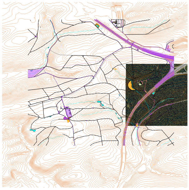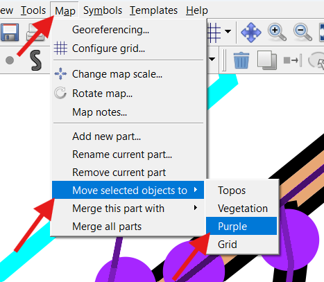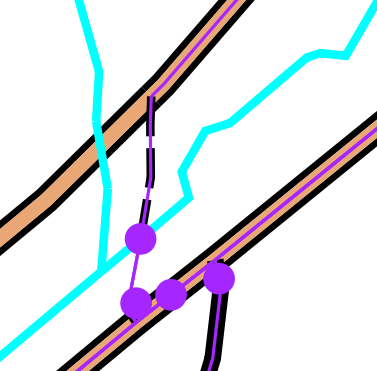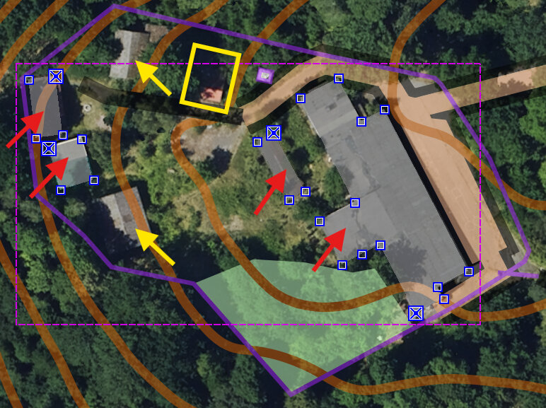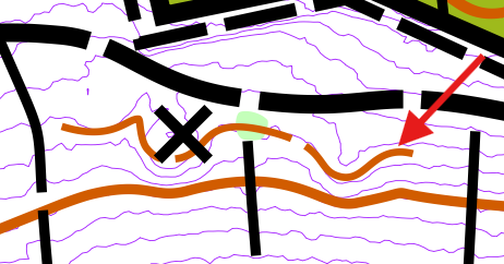 Inevitably there will be more things to verify. Mark them with purple markers for future field-checking. In some ways this is a never-ending process. But if you get to the point where you need to use your map for an actual event, it is possible to temporarily move the purple stuff out of the way. All you have to do, like in this section, is move all the purple stuff to a different 'part', and hide it or shift it to the side. If you decide to shift it to the side, make sure you create a reference point marker to help you move it back when you're done creating the event map.