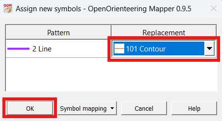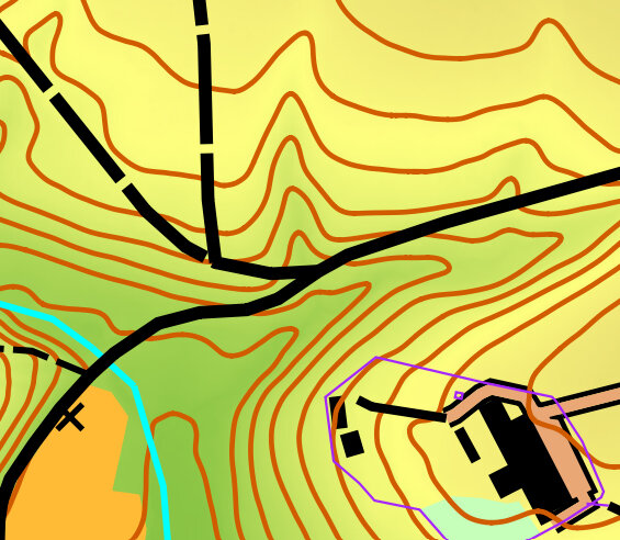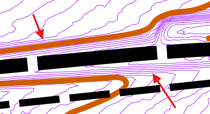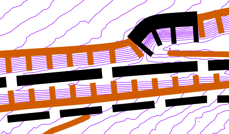 NOTE: Make sure you use the proper direction (the hatch marks should face downhill). Also, keep in mind that some extra edits may be needed to keep the map ledgible for competitors. If you are unsure of which edits need to be made for ledgibility, check out the rules at the O-Map Wiki page.