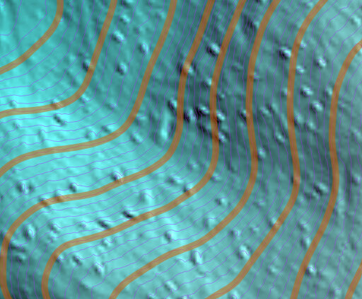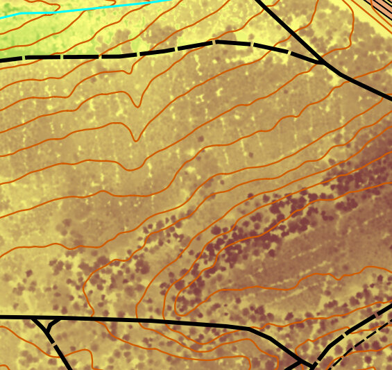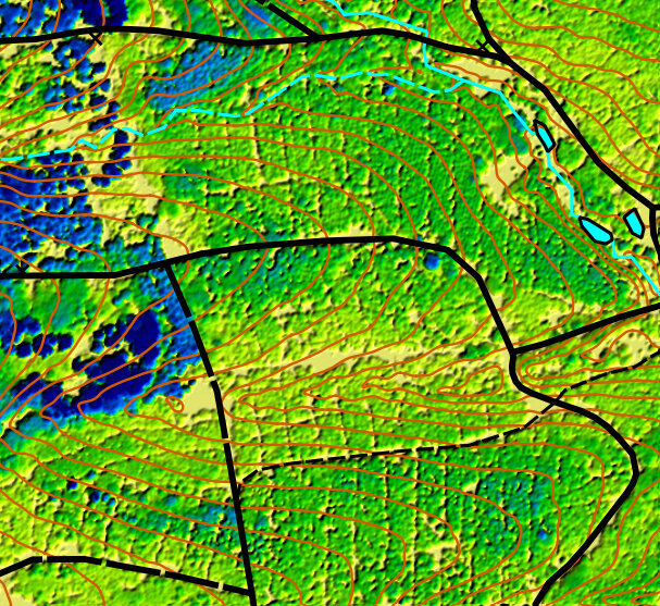 By examining small repetitive patterns in the micro-contours, we can identify the location of probable small erosion gullies (symbol 108), erosion gulleys (symbol 107), possible narrow marshes (symbol 309), and other micro linear features that we would ordinarily include on an orienteering map.