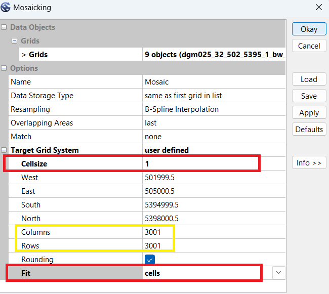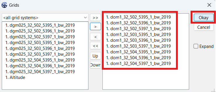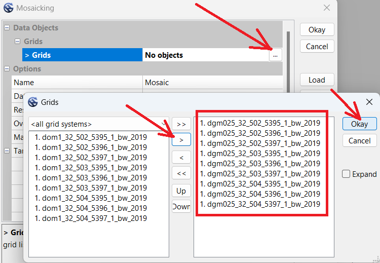 - In the Mosaicking window, click the "..." button to open the 'Grids' selection window.