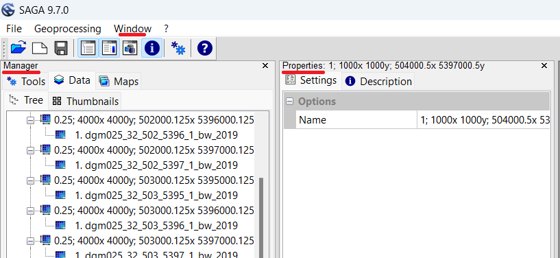 NOTE: When using SAGA, on the far left is the "Manager" window. We can see the LIDAR files we just loaded in this window, and any other files we've created. Right of that is the "Object Properties" window, which we will use to adjust properties of selected files. If either window is closed, simply select the "Window" menu, and re-check the option you wish to see.