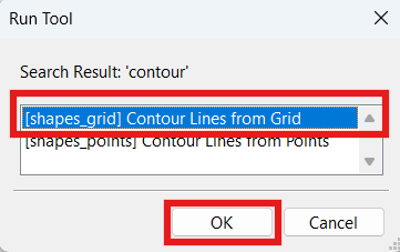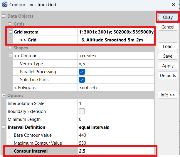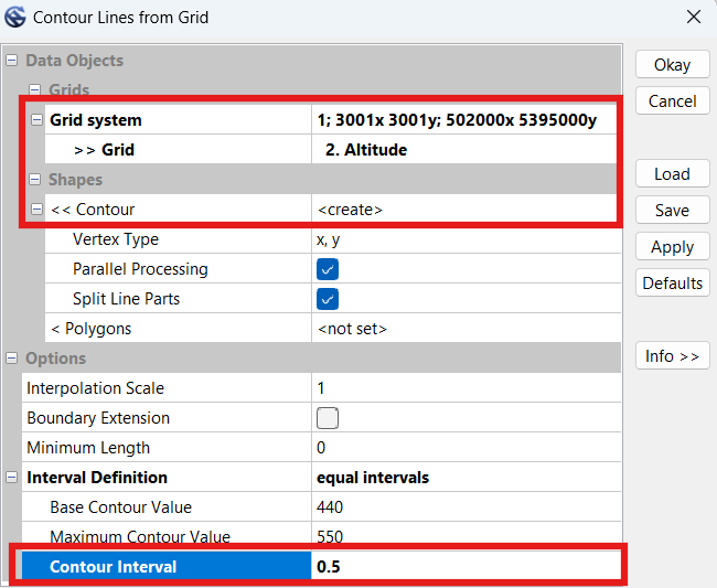 - Load the 'Contours_0.5m_Raw' template, and select the 'default part' of the map.