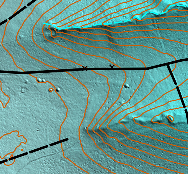 - Load 'Contours_0.5m_Raw' template and examine the map for any bunches of contour lines close together indicating steep slope.