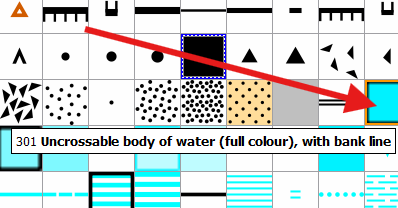 A similar process can be used to identify areas of earth bank (symbol 104), or cliff (symbol 202) or impassible cliff (symbol 201).